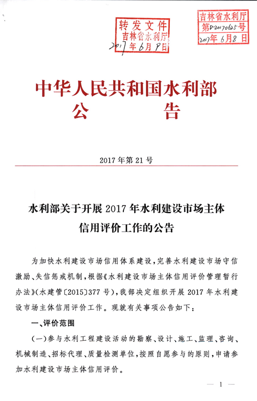 吉林省水利廳轉(zhuǎn)發(fā)水利部關(guān)于開展2017年水利建設(shè)市場主體信用評價工作的公告